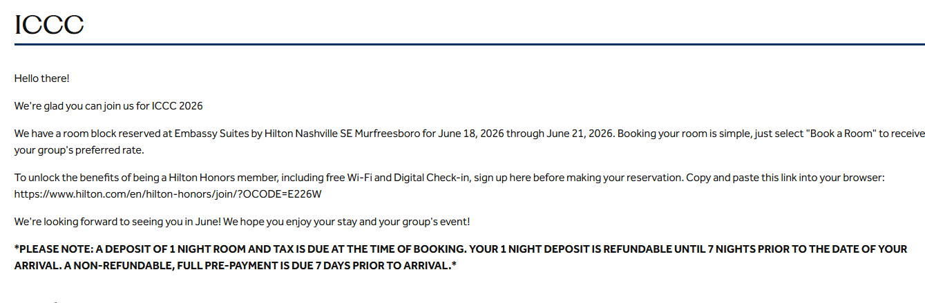 Embassy Suites Nashville SE in Murfreesboro, TN is offering all ICCC 2025 guests a discounted room rate starting at $209 from June 19th - June 21st, 2026.