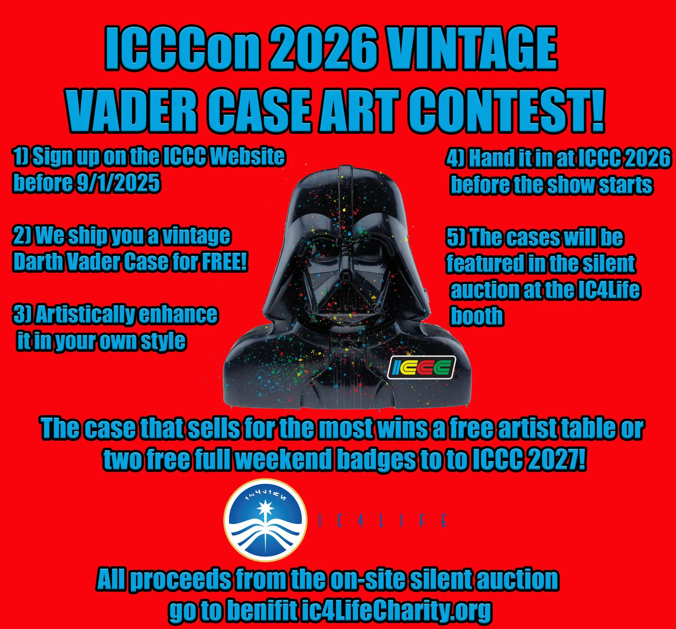 ICCCon 2026 Vader Art Contest. Sign up below if you would like to submit an application to compete for your chance to win a free artist booth or two free GA tickets to ICCC 2027! Only 15 cases will be shipped.